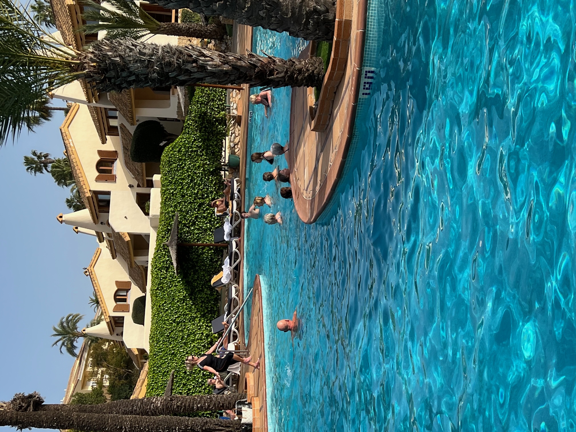 På onsdagen var det fantastiskt väder, 21 grader på termometern! Perfekt för lite vattengympa innan middagen. I den uppvärmda poolen var det bra tryck till häftig musik.
