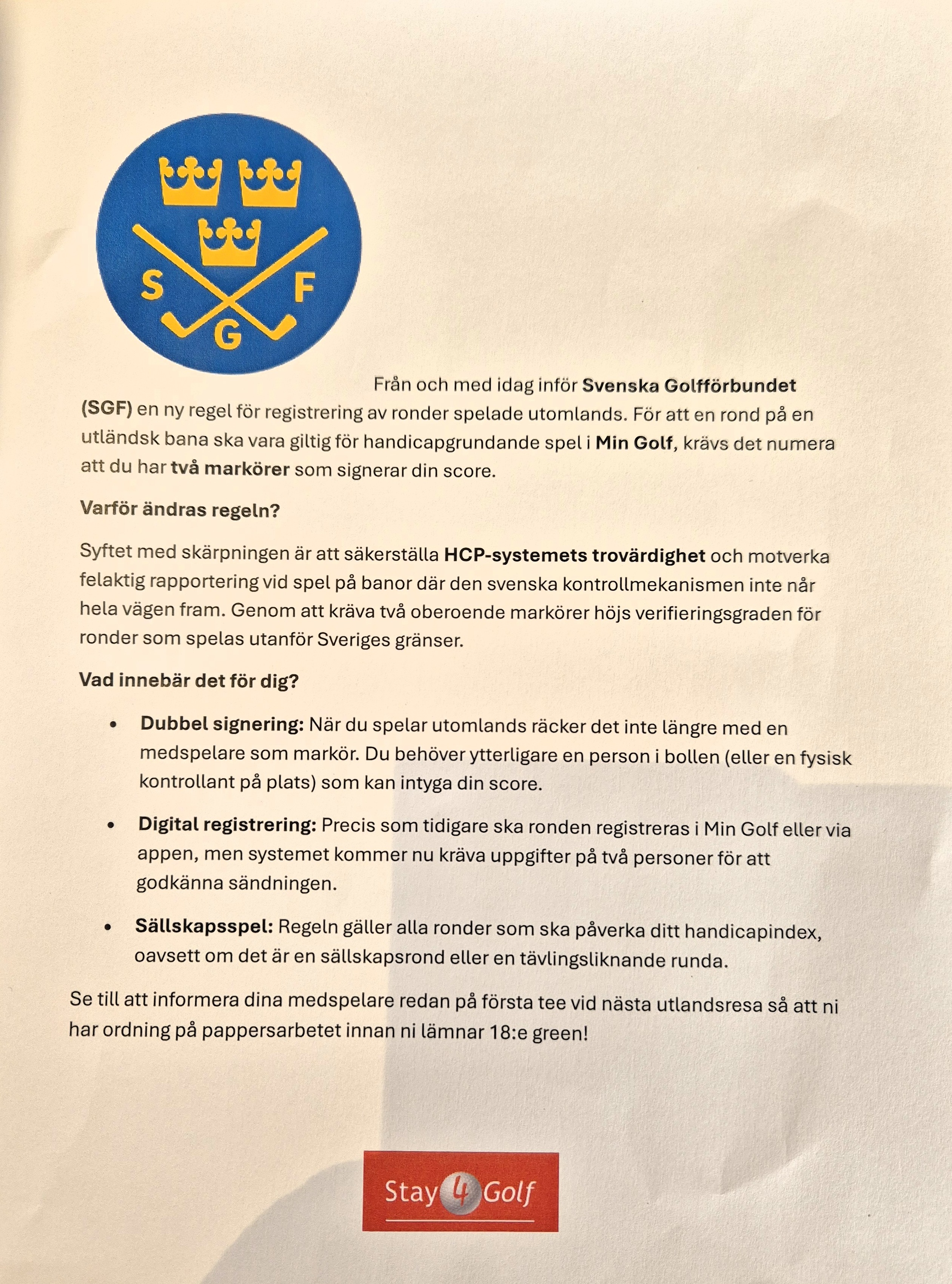 På de första 6 hålen räknas ett resultat ( det bästa), nästa 6 hål räknas de två bästa resultaten. Nästa 5 hål räknas de 3 bästa resultaten och på sista 18e hålet måste allas resultat räknas.