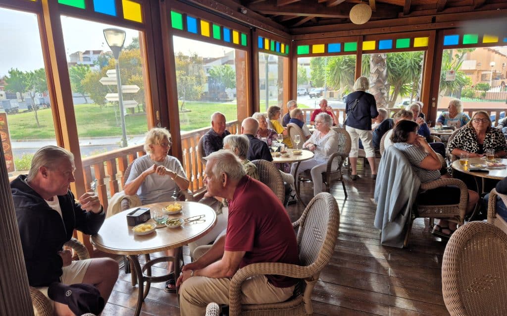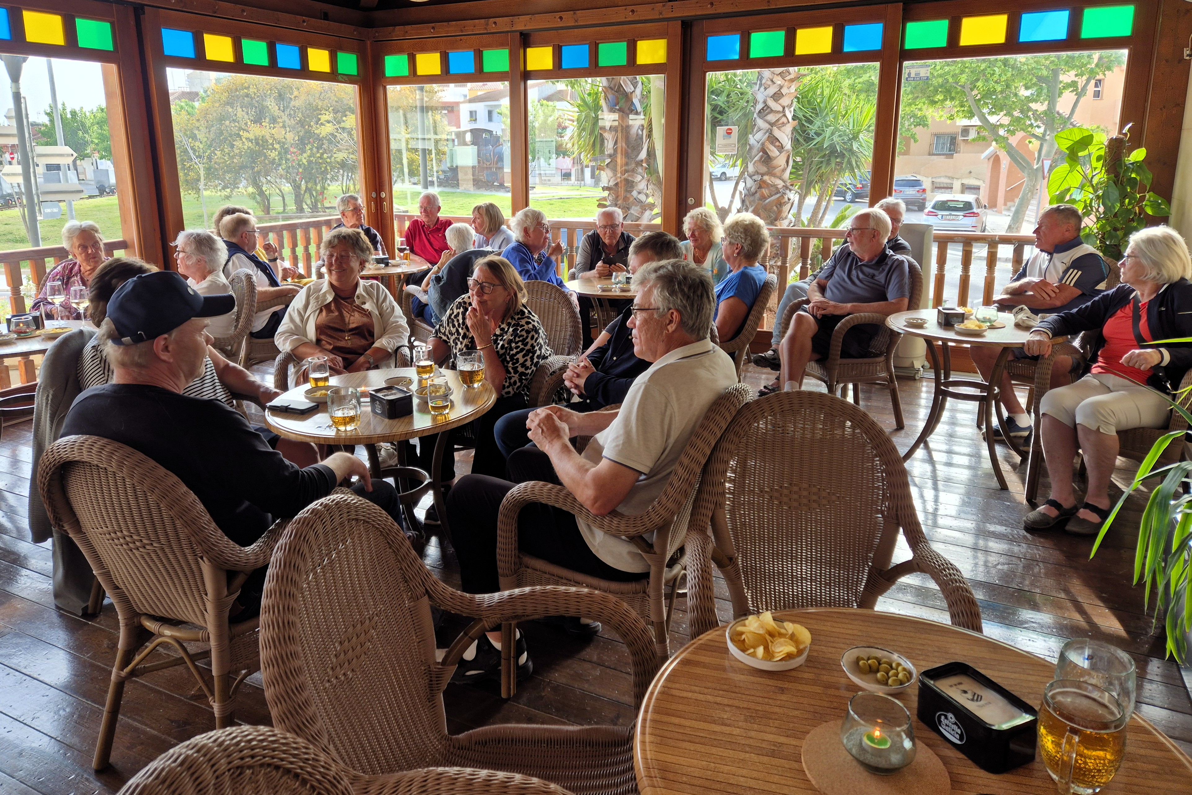 Incheckning sker på terrassen i solen. Den värmer skönt.