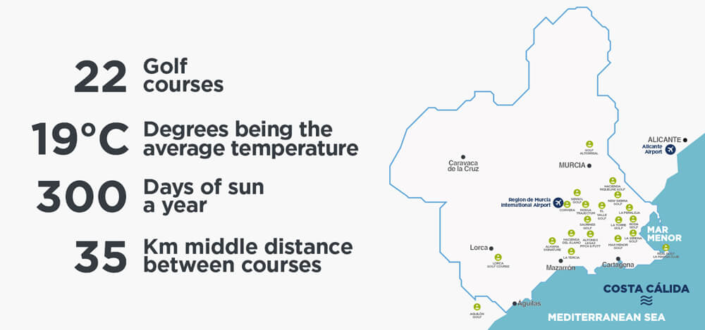 Mar Menor har tre fina golfbanor varav en, den trevliga parkbanan Mar Menor och dessutom kan du spela den spektakulära ”ökenbanan” Saurines samt mästerskapsbanan Hacienda del Alamo designad av Dave Thomas, här finns även en jättebra träningsanläggning med bla Academy Course, en 6 håls träningsbana allt.