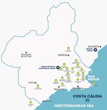 Costa Cálida – den varma kusten – med mer än 200 km kuststräcka med häpnadsväckande och ibland dolda stränder, spektakulära berglandskap, tallskog och den berömda lagunen Mar Menor som är Europas största saltvattenlagun.